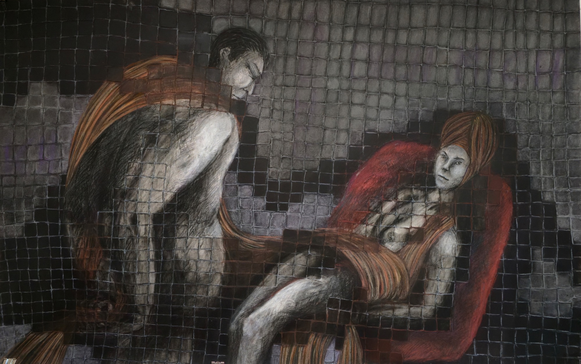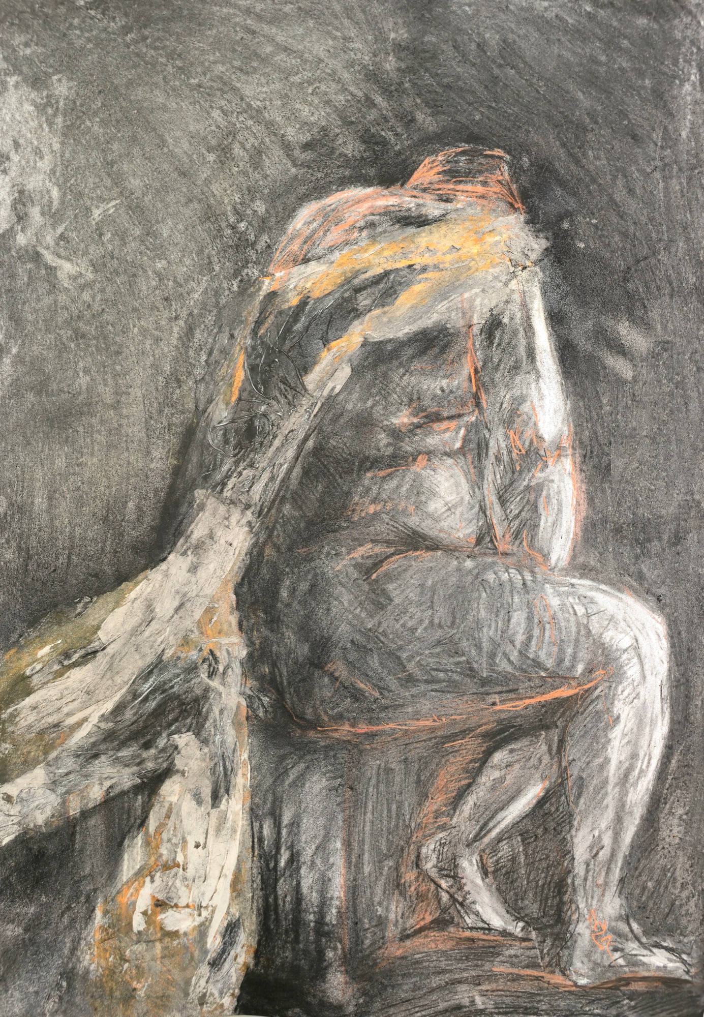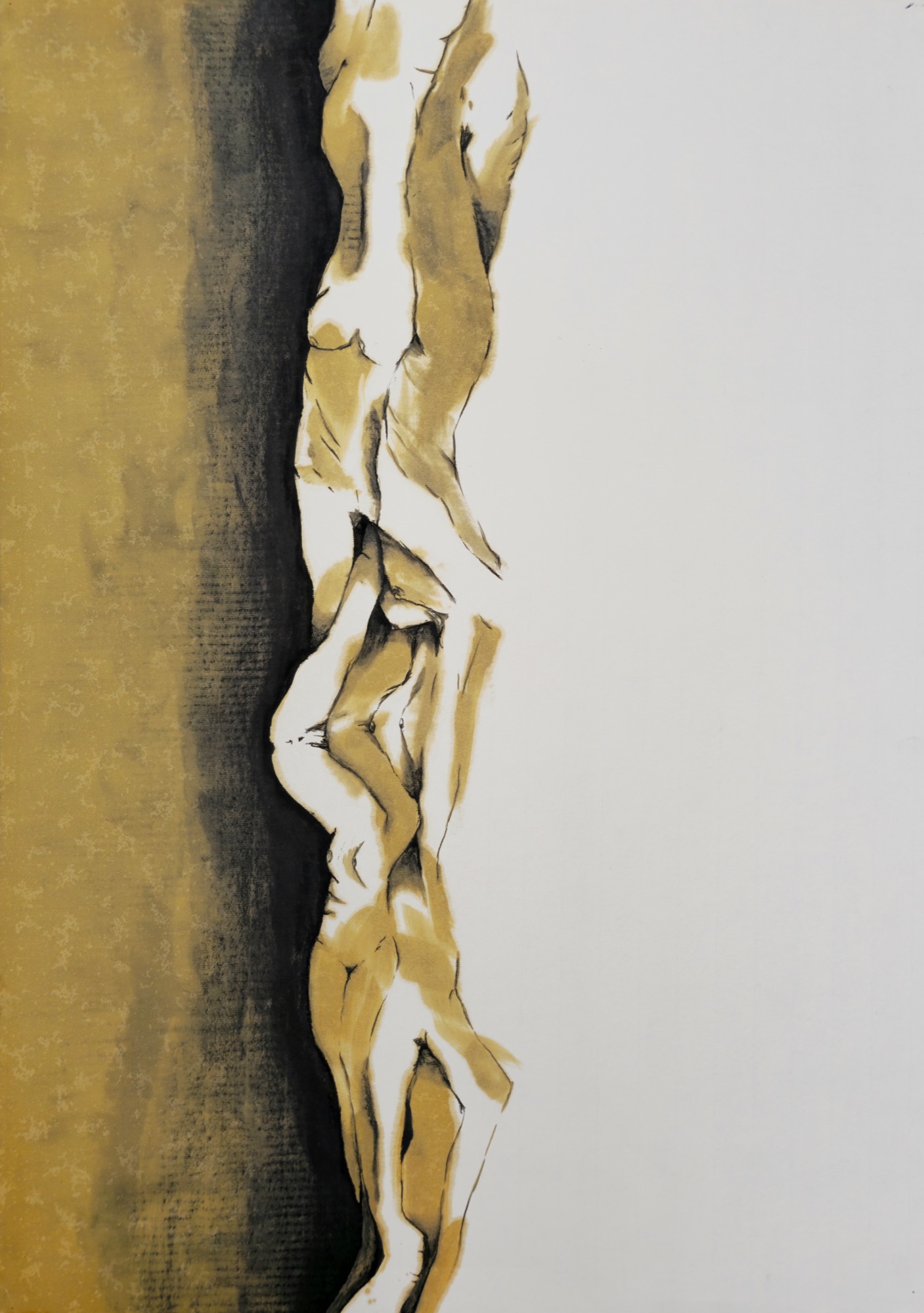 Körper sind kraftvolle Inspirationsquellen, die mich in jeder kreativen Phase begleiten. Dabei können sich die Körper verformen, miteinander verschmelzen, abstrakte Strukturen bilden oder mit Dingen, wie dem Gewand, zur Einheit werden.